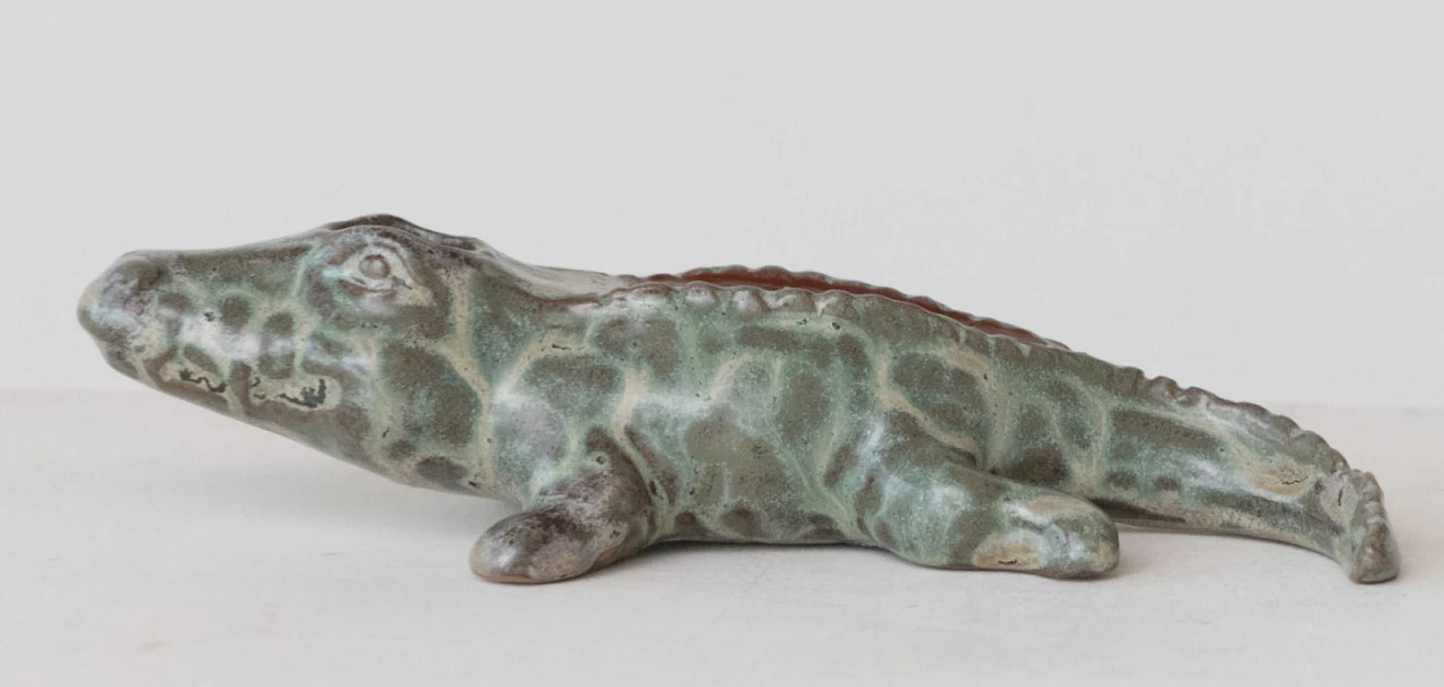 The reactive glaze in varying shades of green ensures that each holder is distinct, reflecting the diverse tones of the alligator's habitat.